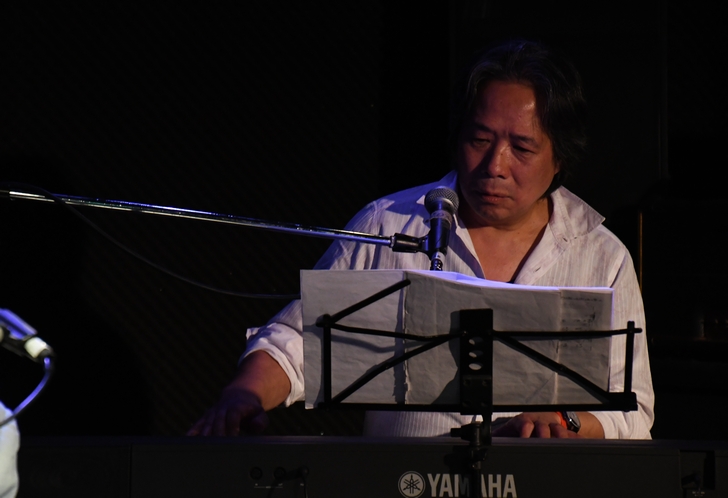 もちろん、ハートサインとコールもばっちり!みんなが笑顔になったところで、少しの間をおいて響いたのは、 恩田さんの奏でる、柔らかいけれどぴんと芯の通った、ただ1つの音。 諸岡さんはギターを置いて立ち上がり、呼吸をはかるかのように間合いを溜めて、 そこからまた溜めて…歌い出したところでハプニング。 何が起こったのかは会場にいた方だけの秘密…ですが、珍しいこともあるもので。 深くひと呼吸して、座っての仕切り直しとなったのは、"今"。 時にアカペラにも聴こえるほど情感のこもった歌声と、深みのあるベース。 そして高く低く歌に添うピアノの音色の3つが織りなす、珠玉の時間でした。 音の余韻をしっとりとピアノで繋いだのは"Heart to Heart"。これが今日イチの絶品…! 歌い出しの一声で思わず息をのんだほど。フェイクを交えての歌声に、途中で詞に合わせて手をそっと胸に当てた一瞬の仕草。 ここ数年のライブでさらに魅力を増したこの曲ですが、今日はその中でも特筆モノだったかと…。 続いては、「音源にしていないこの曲を、気に入ってくれた方が今日いらしているので…」と"ガラス越しの町と君の唇"を。