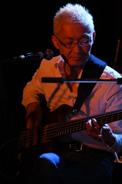 その余韻を断つような強いストロークから"アンジェリーナ"へ。アコギ1本ではじく、鋭くて渋い音。 前半の1コーラスは弾き語り、次に中さんと恩田さんが入るのですが 3人なのにこの緩急、そしてさすがの呼吸! MCでは、中さんも加わっての今回のツアーの話題をあれこれ。 今日は佐世保の同級生の方たちがいらしているということで、 先月行われた、アルカスSASEBOでのライブのことも。 そして、今日PAを担当されていたのが、何と諸岡さんが大病から復帰された時のライブに 飛び入りで登場されたカツヤさんでした…! (そのライブの模様は→→2010.2.5 @アートカフェフレンズ) お聞きしてびっくり。そういえばあの時、名古屋から岡本さんの使う楽器を調達してきた… なんてお話があったのを思い出しました。 それが、もう25年近く前ですか…。長い間には、こんなことにも出会えるんですね。 昼間に生配信されていた、大阪から名古屋への移動中のハプニング。 一路、名古屋に向かっていたはずが、何故か大阪に戻っていたという(笑) 「さまよう俺たち」と、MCを歌詞にかけて、"さまよう〜♪"のフレーズから歌い出したのは"空"。 静かなようで粒のはっきりした音色に乗せて、高く深く広がっていく諸岡さんの声、そこに重なるベースラインと中さんの歌声。