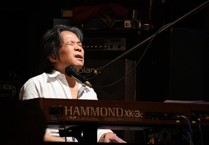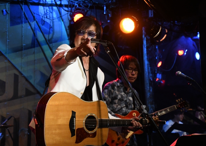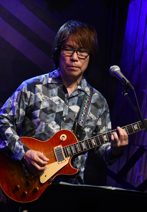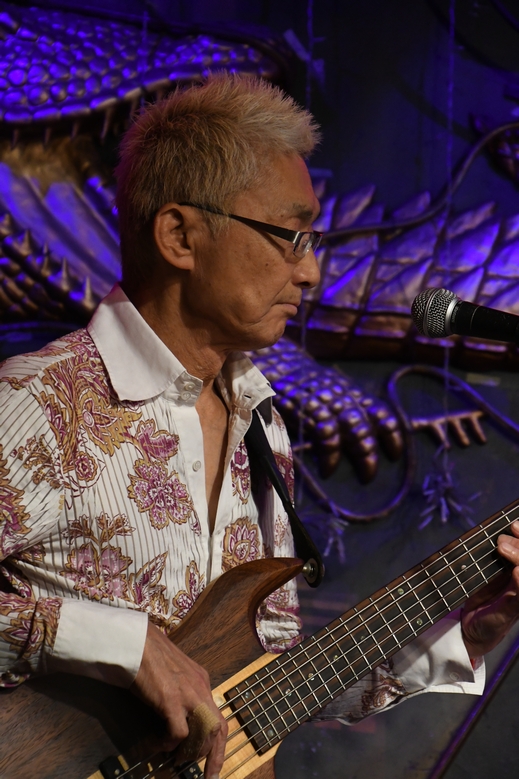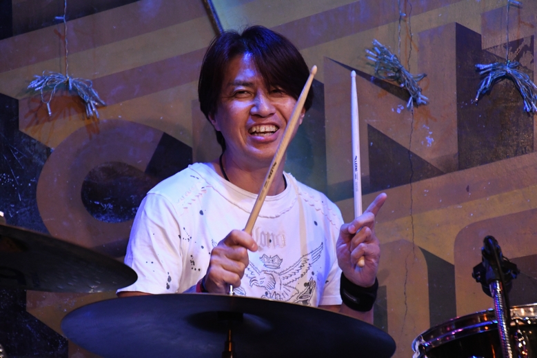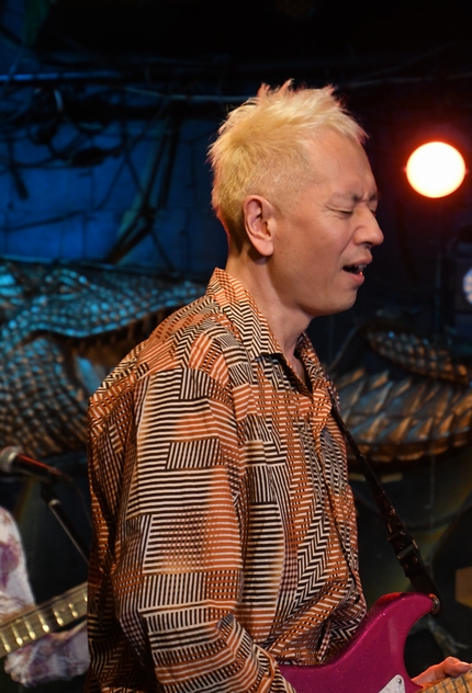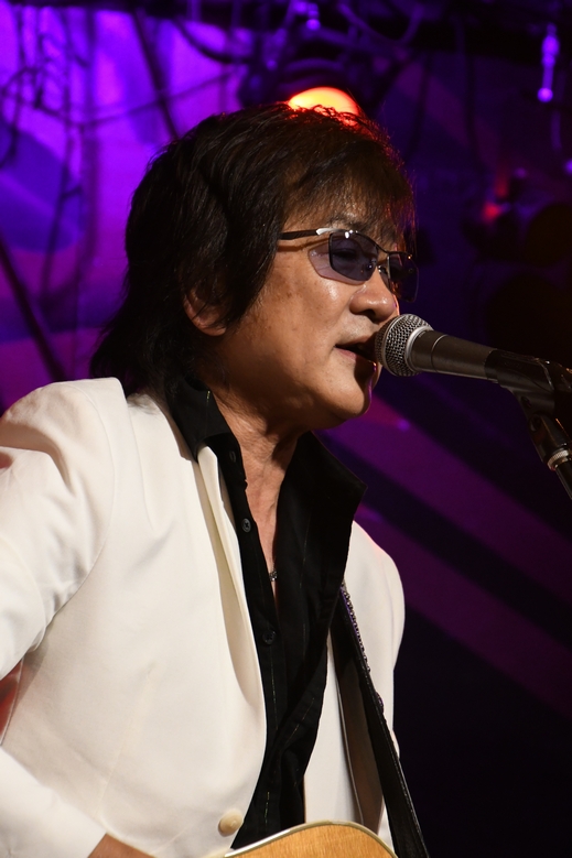 間奏のツインギターに、アウトロの土方さんのソロも圧巻!そして力強いアコギから始まる"凹んでんじゃねえ"。 そこに麿さんの音が重なり、続いて土方さんの音色g加わり。 低めの響きと変則的なリズムが生み出す音の緩急が絶妙で、 同じフレーズでもアプローチがそれぞれ違っていて。 3本が重なると、こんなに太さのある展開になるんですね。 諸岡さんはフロアに"Keep On!!"のコールを煽りつつ、 メンバーの皆さんにも1人ずつ振って歌わせていくのですが それぞれ声にも歌い方にも個性があって楽しい♪ (でも、周ちゃんだけ振られていなかったような…?) ひとしきりの後、諸岡さんの「土方さんのギター!」の一言から 一気にソロタイムに突入! 土方さんの少し驚いたような表情、もしかして(いつもの)予定外の流れだったのでしょうか(笑) ソロは恩田さん、そして麿さんへと続き、その後は土方さん&麿さんが交互に弾きあうというツインギターの魅力たっぷり。