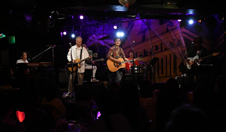 ここで今日最初のMC。先日、お誕生日を迎えた諸岡さん、ひとつ年を重ねての初ステージが 今日、ホワイトデーだということでこの歌を…と、フェイクを交えて "風の中のストーリー"をアコギ1本でゆっくりと歌い上げ…からのカウントで 改めてバンドでのイントロへ。この曲にしてはかなりゆっくりなテンポが新鮮! …と思っていたら徐々にテンポアップ。歌い出す時にはいつもと同じくらいになっていたかな? それぞれの音色が際立ちながら調和する揺れ感に、土方さんと中さんのコーラスがいい感じ。 歌と音の余韻を受けてのMCでは、ここでもホワイトデーに因んで?麿さんとひとしきり(笑) このカケアイの呼吸、ほんっとに昔から変わらなくてむしろ実家な安心感♪ そして、「早くも叫ぶコーナーが来ました!」と振る諸岡さんに、歓声と拍手で応えるフロア。 「…わかってない人いる?」の問いに、1人の手も上がらず(!)、ばっちり一発で決まるコール。 合わさる声とあちこちで上がるハートに笑顔を返し、そのままカウントでイントロへ。 すっかり定番となった曲前のコールで、いつもたくさんの笑顔から始まる曲になりました。 "秘密基地"の収録曲は、ライブ先行よりリリース先行の楽曲が多いんですよね。 この"Love Me Tender"もそうですが、ライブでどんどん変化していく姿を楽しむ贅沢、 それがたっぷりと味わえるアルバムなのです。この曲では、歌声や演奏はもちろん、ちょっと悪戯っぽい表情の諸岡さんもお見逃しなく…♪ そして、音終わりに恩田さんへちらりと目くばせをして"Lady"へ。 この阿吽の呼吸と、流れ出す柔らかくも強いピアノの音色にココロの中で拍手喝采。 これ、何度聴いても最高に痺れますー!! イントロのリフは土方さんが奏で、高く謳いあげた音が一瞬静まって、 その後に入ってくる諸岡さんの歌い出しの声が今日も絶品。 "砕け散った夢も…"のフレーズで諸岡さんが見せた一瞬のハンドアクション、 サビでアコギ1本におとした音色から再びバンドが合流する展開、 そこに貫いて響くピアノの音色…もう、歌詞がアチコチしたのなんか気になりませんとも(笑) 終盤の土方さんのフレーズも、フロアから届くいつもと違う手拍子のリズムも新鮮でした。 諸岡さん、この手拍子のリズムがお気に召したようで「この曲はコレで!」といい笑顔。 ここで、暑いんで…と上着を脱ぎ、アコギを爪弾きはじめた諸岡さん。 そのフレーズに「ん?コレってまさか…」と思っていたらやっぱり! "You're in my Heart"、HONDAのCMで起用されたこの曲を1コーラスだけ歌って MCはCMソングの話題へ。珍しく、"7月の女神-Venus in July-"も1コーラス歌ってくれたんですよねー。