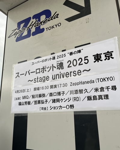 諸岡さんがアニソンの一大イベント、スーパーロボット魂に4年ぶりのご出演♪ 前々回の2020年、そして前回の2021年…と続けて配信で参加でしたが、今回は念願の?現地参戦! 会場を取り巻く入場列は、急に降り出した雨も吹き飛ばすほどの熱気に溢れておりました。 あの人数の中、偶然びっくりな出会いもありつつ中に入ると、広い会場を埋めつくす観客の開幕前からの熱量に圧倒…。 チケットが抽選なのも頷けますねえ…(第一希望のエリア、見事に落ちました) 本日ご出演の皆さま(掲載順) MIQ/鮎川麻弥/森口博子/川添智久/米倉千尋/福山芳樹/笠原弘子/諸岡ケンジ(RD)/飯島真理