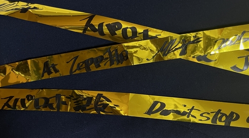 お裾分けいただいた金銀テープに、記念のサインも★普段のライブとは違う、それでもやっぱり諸岡さんを感じるステージ。 今回もめいっぱい、楽しませていただきました! …この会場に来ている方と、次は諸岡さんのライブで会えますように♪ ←Back to Live Report Menu |