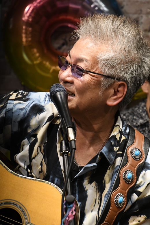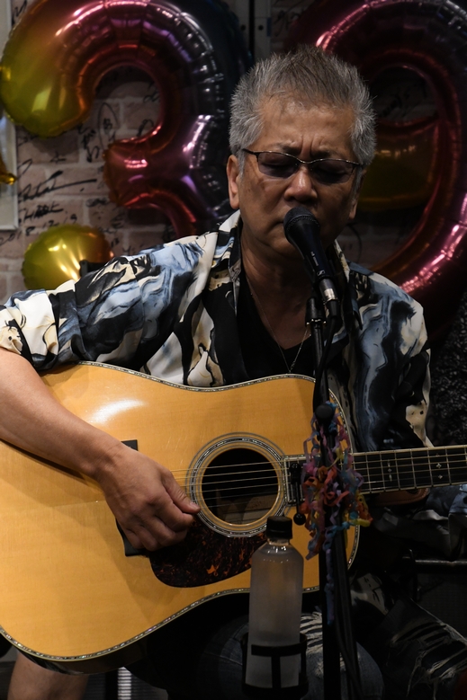 ひと息おき、"三人衆"の原点となるエピソードを挟んで"Eternity"。諸岡さんはギターを置き、お祝いのお花を手に。 それを笑顔で見つめながら歌声を紡ぎ、今度は立ち上がって 飾られていた星型のバルーンを掲げて"7つの星に…♪"と再びの笑顔。 何だかココロに色々と浮かんできて、気付けばホロリ。 きっと、今のこの時もまた、醒めない夢…のひとつ、ですね。 そして、スローから徐々にテンポを上げた"少年"は、 「東京に出てきた頃は何も恐れず、自分の夢を疑うこともなかった」 そんなMCも相まって、圧巻・圧倒のひとことに尽きました。 動悸を覚えるほどの声の熱と、そこに込められた感情。 節目の今日だから、なおさらにそう感じたのでしょうか。 そこから、柔らかく爪弾くアコギで歌われた"今"。 ラスサビ前に間奏の入るアレンジ、そしてメンバー紹介からのソロへ。