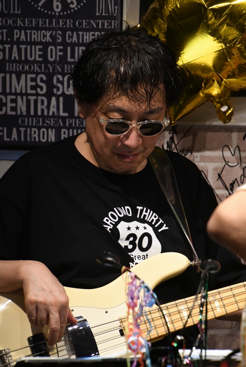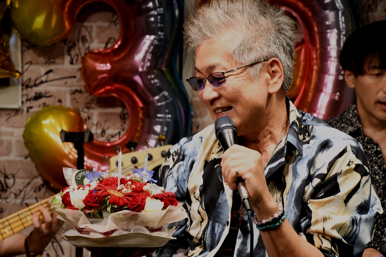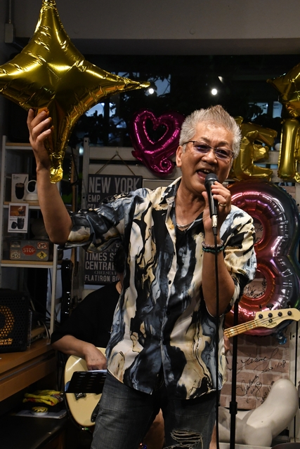 お馴染み"三人衆"、今回のライブは諸岡さんのデビュー39周年の当日! そして、6月はいつも素敵な時間を過ごさせてくれるZOHMの純子さんのBirthday♪ これはもう、ダブルでお祝いだよね!と、有志メンバーズであれこれと楽しく画策して臨みました(笑) M屋さんがたくさんご用意くださった、色とりどりのバルーンで彩られたステージに揃った3人。
