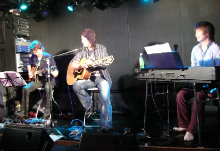向かって左から、中川さんのEG、諸岡さんのAG、大柿さんのKey、の3人編成。いつもより、ちょっとだけラフな表情の皆さん。 Key.からスタートの"さよならを消せなくて"でライブが始まりました。 何か、久々に聴く気がするですね、この曲♪ この歌の、あるフレーズを聞くたびにToshiyaさんの顔が浮かぶんですよ。 初めて聴いた場所、あのマローネの雰囲気と夕焼け色のライトと一緒に、ね。 そして、「初めまして〜〜!」とヒトコトMC! 初めましてな方が…どれだけいたんだっ??って気もしますがスルーして(笑) ゆっくりめ、なテンポの"Lovin'"。 アコースティックなようで、そうでないようで…という音の響き具合と重さが意外なほど合ってました(o^-')b で、ここで気づいたことがひとーつ。 大柿さん、どうして靴はいてないんだろう(謎) …再び閑話休題。 本日は…んーと…とっても閑古鳥…な寂しい客席なわけですが、その分のんびりな雰囲気でもあったわけで。 「何か、僕の部屋みたいですね!…こんなにきれいじゃないけど(笑)」 諸岡さんのMCも、いつにも増して大変にフレンドリーです。前の出演者の人と握手したりとか(笑)