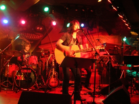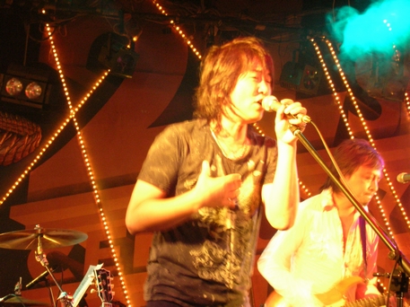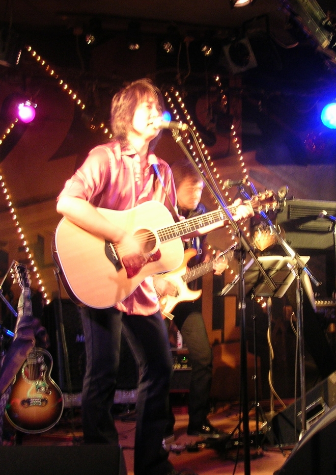 最後のギターのフレーズも、ちょっと切ない音で。MCでは、今度「諸岡ケンジ」としては初めて お芝居の舞台を踏む…ということで、キャストの2人をステージへ。 今日、客席の一部が妙に賑やかだったのはこれかー。 上げられた2人は緊張されてるのか硬くなっていて、 中川さんがフォローを入れたり、客席から突っ込みが入ったりする ものの、見事に間が続かない>< 微笑ましくもあり、頑張れー♪という気持ちにはなったけれど …曲の流れ切ってまでココで紹介しなくてもいいんじゃ(・・。)ゞ ともあれ、セリフは噛むけど歌は噛まない!との力強い?宣言で 2月にお披露目された、"スタートライン"からLiveが再開。 途中、珍しくハンドマイクで。 曲調は明るいけれど、ちょっと大人な雰囲気。いつもより、少し低めの音&転調が入るからかな? くるくると色を変えるギターのソロに拍手!最近の曲はアップテンポが多い気がしますねー。 ![]() そして、この日は雨降り(ライブの頃には止んでたけれど)だったんですが… いきなり「雨男」として客席にいたToshiyaさんを紹介。 人生の雨降りだった頃に2人でGt弾いて、Liveして。焦ったりもしたけれど、 Toshiyaがいたから救われてた、感謝してる…と。 一緒にやってた頃には、あんまりそんな言葉をかけるのを聞いたことがなくて。 今日はどうしたのかな。 そんなToshiyaさんに捧げる歌を、と"少年"。 諸岡さんのアコギの爪弾きから、一気にバンドの音が入ったのを聴いていて 当時のお2人を知ってる身としては…うん、感慨深かったです。 一瞬ね、バンドの音が聴こえなくなって、2人だけで演ってらした頃の… あのアコースティックの音が聴こえるような気がしました。 第一部のラストは"Endress Road"。 前の曲で感傷的になっているからか、やっぱり2人での佐世保の初Liveのあれやこれやを思い出し。 音って、記憶と鮮烈に結びついてるんですね。 ![]() インターバル明けての第二部。 一人でギターを抱えて登場した諸岡さん、前振りもなく爪弾き始めて。 これも2月に新曲お披露目だった"素直になれなくて"。 初めて女の子の視点で書いた、と言っていた曲ですね。 前回聴いた時より、ストレートに伝わってくる感じ。 でも…ですね。ええい、ギャラリーがうるさい(怒) Gt1本の静かなバラードで、何でそんな場違いな拍手やかけ声するのー! お酒が入って盛り上がるのはいいけれど…お願いだから聴かせて>< と、幕開きから若干うーうーした気分に。 続くMCでは再び舞台の方を1人、ステージに上げてご紹介。 多才な方らしく、モノマネ始めたり、歌いだしたり…と賑やか。 …でも、ごめんなさい。一部の人はすごい盛り上がっていたけれど、 私は諸岡さんの歌が聴きたくて来てるの!って言いたくなった。ココロ狭すぎてすみません。でも本音なんだ、仕方ない。 ようやく(と言ってしまうのもごめんなさい、ですが)メンバー紹介、で皆さんが1人ずつステージへ。 「新曲やります!」と始まった曲。タイトル言ってくれないからわからずじまい(笑)