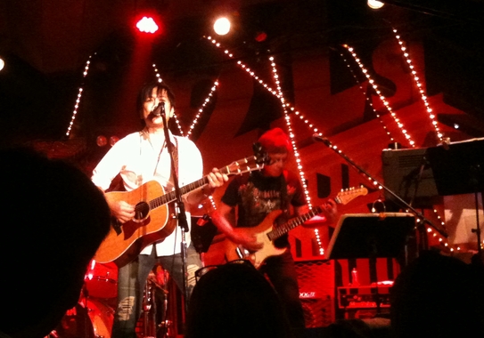 続いて、シャッフルなドラムのリズムだけに乗せて諸岡さんが"愛しておくれよ"とコール。 「もっとー!」って皆に叫ばせて、いつもより 少しだけスローな"Lovin'"のイントロへ。 この入り方、初めてかも。渋カッコいい♪ ギターソロは、上田さん→中川さんとリレー。 お2人それぞれで、聴いてて楽しい! アウトロで重なり合う旋律も華やかで、 ツインギターだからこその贅沢ですねー。 そして、最後の音にかぶせるような諸岡さんの アコギの音から"風の中のストーリー"。 サビから入ったんだけど、歌いながらいきなり"聞かせておく…中川!"と振る諸岡さん。 慌てて? "すとーりー♪(やや棒)"と中川さん。続けてもう1回、今度は「さん、はい!」って。 コレは仕込みなのかアドリブなのか(笑) そして3回目は「みんないくよー!」と客席へ。でもまあ、空振りするのはお約束ですよねっ。 「ストーリー♪ね、ストーリー♪」なーんてご指導が入って、もう1回。 でも今ひとつだったようで、カツゼツ悪いよ君たち!って…諸岡さんにだけは言われたくな(略) メンバーも客席も大笑い。最後にもう1回だけ、とみんなで歌って、無事にイントロへ♪ こんなやり取り、Liveならでは。一度行くとまた行きたくなる中毒因子です(笑) MCで安定した笑いをかっさらい(?)つつ、軽やかなKeyのイントロからの"戻れない夏"はギターを手放し、マイクを手に。 ここ数年、アコギ抱えて歌う姿が当たり前になっていたので何だか新鮮。 最後の爽やかな音の余韻が消え、ほんの一拍を置いて鳴り響いたのは中川さんのソロ! その一音で雰囲気が一変して、"体より心が"へ。ほんとにね、空気の温度と色が変わったように感じたんです。音って凄い。 バックで細かく刻まれるギターと、コロコロと転がるようなピアノの音色が絡まりあって気持ちいい。 この曲のサビ前のドラムが大好きなんです!何とも言えずカッコいいのよー♪ 続くMCでは、突然"なんでんかんでん"の社長 川原ひろしさんがゲストとしてご紹介され、ステージへ。 えーと、話が唐突すぎてどう反応していいかわからない客席の様子に、もう1回最初から紹介しなおす諸岡さん>< 今度は万雷の拍手でお迎えしましたとも(笑)お店の無料券とカンツォーネを1フレーズご披露していかれました。 そして「新曲を作ってきました。聞きたい?どんな曲か知ってる?」…あの、新曲ですよね?(笑) 女の子の名前にした、というタイトルは"アンジェリーナ"。それって佐野元春じゃん、と思ったのは内緒。 結構アップテンポで、イントロのキーボードのブラスっぽい音と煌びやかなフレーズが印象的。何かオトナな音だぁ。 そこに初っ端から全開でギターが重なって、POPじゃなくてROCK!って感じ。こういう曲調、最近では珍しいんじゃ? 体が自然に揺れちゃうようなリズムとメロディ。このバンド編成ならでは、のサウンドですねー♪ これからLiveを重ねるごとに、どんな風に変わっていくのか楽しみです! 第一部はMCもやや軽め。今日はネット繋がりから再会した小学生時代の同級生がいらしている…とのこと。 最後の曲は、しっとりと"Eternity"。いつもよりエフェクトが少しだけ強めで、ゆらゆらと漂うような響きが素敵でした。 ![]() 第二部は諸岡さんが1人だけで登場し、"Heart to Heart"を1フレーズ。 そのままアコギ1本で歌いだしたのは"レクイエム"。 1か所だけね、「俺に」の歌詞を「おいに」って歌ってたー! これは同級生の方がいらしてたから、だったんでしょうか。 そして、メンバーの皆さんを1人ずつ呼び上げ、曲は"少年"へ。 この曲の中川さんのコーラス、柔らかいのに強い声で大好きなんです♪ ここでMC…なんですが、紹介されて登場したのは何とToshiyaさん!! わー、諸岡さんと同じステージに立ってるのを見るの、久しぶり。 "Mother"を作った時の話。歌入れてて泣いたのは初めて、なのだとか。 病気になった時のことや、ご家族のこと…徒然に話してくれました。 Toshiyaさんが加わっての一曲は、その"Mother"を。 音がさらに厚くなって、原曲のオーケストレーションを彷彿とさせるよう。 でも実は、せっかくのギターのリフが所々でよく聴こえなかった…トリプルギターですもんね、仕方ないんですが>< ラスト近く、ギターソロの後にボーカルが入るところで、諸岡さんとToshiyaさんが肩を寄せ合ってたのがカッコよかったー! 歌終わりのMCでも、話題はToshiyaさん。「心許せる友達です」って。 そして「友達は大事だよな、みんなは俺の友達かい?」…えーと、Fanです(笑) 友達話題つながり、で"友よ"を挟み、またしてもゲスト様が登場。 …う、お名前を失念(すみません)。"Desperado"を歌われたんですが、珍しく佐倉さんに余裕がなかったような? ゲストが多いからなのか、それとも(いつものように)だんだん崩れていくMCのせいだったのでしょうか(笑) RDのことを話していたので、まさか?と思ったら本当にまさかの"Don't Stop!Carry On!"。 これLiveでやるなんて何年ぶり…というか、ソロだとほぼ初めてじゃないですか?