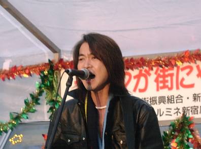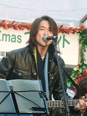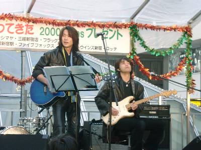マローネでおなじみの4組の皆さんの出演のうち、諸岡さんはラスト♪で、イベントにつきものとは言えやっぱり時間はかなり押していき… (その間、う〜ろうろと歩き回る諸岡さんがあちこちで目撃され(笑)) 結局30分以上(だったかな?)遅れてのスタート。 かなり慌ててセッティングしていた2人でしたが、 どうもToshiyaさんの機材がトラブル?らしく、なかなか音が出ない(^_^;) 「こんにちは〜!諸岡です!」そんな一言のあと、 まずは諸岡さんのアコギ一本で"あの日"。 途中からToshiyaさんのギターもかぶさって、やっといつもの音♪ 今日のイベント、ホントに駅前で、年の瀬ってこともあってかなりの人がいたんだよね。 この日は、ステージのすぐ下で物販のお手伝いさせてもらってたんですが、前から見ててよくわかったことがひとつ。 大きな紙袋とか下げた買い物客の人とかが、音に誘われて立ち止まってくの。 最初、「あれ?何かやってる」って顔して立ち止まった人が、だんだん「ほ〜ぉ」って感じになってくのが見えたりして。 曲の方は、少しテンポを上げて"ルビコンの橋"。