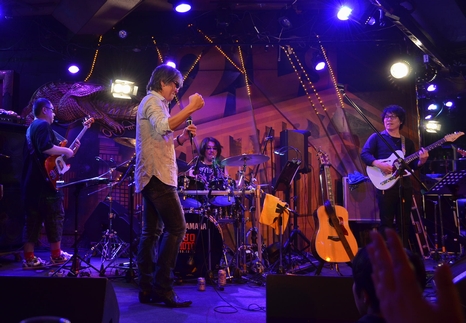そんな話を紡ぐ間、河野さんがずっとピアノで音を添えていて。"HOLD ON"はサビのフレーズから入るアレンジ。イベントの時と同じなんだけど、 …今日は、何だかさらに深い響き。諸岡さんはサビで高く片手を掲げて。 間に入る土方さんのソロ、派手さは控えめなのにすごく熱い。いい音〜! 本当に今日が20年ぶりの再会&初合わせなんですか!と何度思ったか。 MCでは再び、これだけ長い間歌っていられるのは聴いてくれる人たちの…と。 でもね、それってまた聴きたくなる「何か」があるから、なんですよね。 それは諸岡さんの歌に、声に、思いに。そして諸岡さん自身に、ね? そして、CDにしていない曲がたくさんあるので、作戦を考えてます!って やーっと言ってくれた(笑) さー、言ったからには実現させましょ?諸岡さん。 アルバム"Treasure"からの1曲、"Eternity"は、河野さんが2台のKeyで ピアノとストリングスの2音を操り、バンドがフルボリュームで入っているのに その2つの音色がすごく綺麗に響いていました。土方さんのソロも素敵だったー! ラスト、諸岡さんはほとんどマイクなしでフェイク!すごい声量、そして熱量。 あれだけのフル音に全然負けてないの。ほんと、感涙ものでした>< 今度の合間のMCは、岡本さんタイム。…えーと、さっきまでの空気はドコへ(笑) でも、数年前に、岡本さんの「桑名さんの亡くなった年齢を越えた」という一言が響いたという諸岡さん。 うん、それわかる…気がする。ヒヅの年齢越えた時、すごい感じたから>< 何と、土方さんと岡本さんは同い年なのだそうで、ってことはお2人とも61歳…にはとても見えない。 お2人による"60代バトル(By諸岡さん)"。もー、熱い熱い♪ 諸岡さんがトコトコっとステージから下りたなー、と思ったら、そのままステージ前のカウンターに座って見物(笑) バトルはそのまま"アンジェリーナ"のイントロに突入し、諸岡さんも再びステージへ。 振り向きざまのフィンガーホイッスル、カッコよかったー!