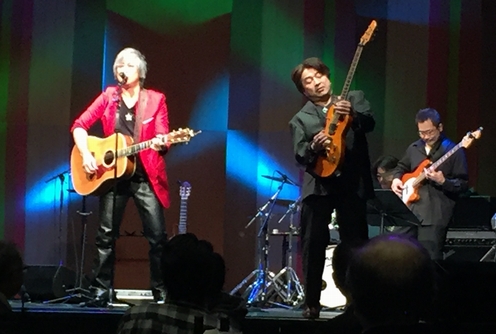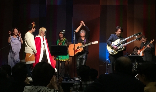 開会の口火をきったのは講談師の神田紫さん。声音と調子はさすがの迫力!"モロケンバンド"との紹介で、オープニングステージ"少年"でパーティが幕開け。 メンバーは、小暮"Jari"孝史(Gt)・前田久博(Ba)・岡本郭男(Dr)・ 山口大祐(Key)…つまり東京自由学院とINXSの講師陣の皆々様ヽ(゜∀゜)ノ 美味しいお料理をいただきつつ、目と耳はステージに釘付けでした。 写真撮り損ねちゃったけど、「笑むすび」さん制作のクリスマスツリーのおにぎり、 可愛いだけでなくとっても美味しかったです! そこからはフラありフラメンコありジャズあり三味線あり太鼓あり…と、 はてさて何人何組の方が登場されるのだろう…という贅沢すぎる音楽三昧! 諸岡さんは、藤名美穂さん(Vo)や学院の生徒さん数人が加わってのメンバーで "Cocoroの翼"を披露。熱い、そして何とも言えずにあったかい音。 生徒の皆さんはサンタやトナカイ、ツリーのクリスマスコスプレで、 ステージではちょっと緊張気味?でしたが、その後には会場内でクジを配ったりと 皆さん大活躍されてましたねー♪ ラストには、山口さんがリード、そして諸岡さんがメインボーカルで"POWER TO THE PEOPLE"を大セッション。 ステージも客席も一緒に大盛り上がりの中、主催代表の素敵なご挨拶をいただいて、あっという間の約3時間が終了。 いい香りのするコーヒー豆やクジでのプレゼントまでお土産にいただいて、何とも幸せなクリスマスイブの夜になりました。