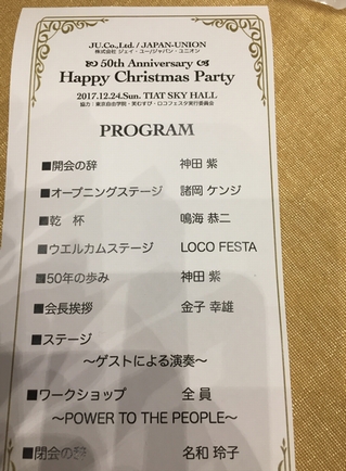 諸岡さんが学院長を務める「東京自由学院」のバックアップをされている、 (株)ジェイ・ユー/音楽事務所ジャパン・ユニオン様の創立50周年のお祝い&クリスマスパーティ。 TIAT SKY HALLは、羽田空港国際線ターミナルの中にあるイベントホールなのですが、時は折しもクリスマスイブ♪ 屋内イルミネーションが輝く素敵な空間を抜けて、わくわくしながら会場へ。 パーティでライブがあって…と聞いていたので、どんな感じなんだろうと思って中に入ると、円卓がたくさん並び、 1人1人に席札があったりドリンクやカラフルなお料理が並んでいたり…と、思ってた以上にパーティーな雰囲気! や、ジーンズ&スニーカーとかで来なくて正解だった(笑)