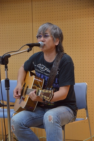 会場は地下1階、「文化ふれあい広場」。セトリやメンバー紹介付きのレジュメをいただいて中へ。 学院のリーフも置いてあったみたいですねー。ありがたい♪ まずは地域の会長さんのご挨拶。 そして諸岡さんと小暮さんの2人でステージがスタート。 1曲目からもはやスタンダードといえる曲、のカバーですが 諸岡さんが歌うと、しっかり諸岡さんの歌なんですよねえ…。 小暮さんのWネックの12弦+諸岡さんのアコギが重なる音も 気持ちいいし、これは今日来て正解!と思った幕開けでした。 その2つのGtの厚みが際立つ2曲目は、"熱き心に"(By 小林旭) ハスキーな声がすっごい合う!!特にサビのとこ!! アップめの曲が2つ続いたところで 「好きな歌を歌っていいですか」と、今度はぐっと抑えた音で "酒と泪と男と女"(By 河島英五)。 …これ、MCの中で突然さらっと歌ったことがありましたねえ。 ちゃんと歌うの聴くのはもちろん初めて。 んー、やっぱりしっかり諸岡さんの歌に聴こえるなと。
