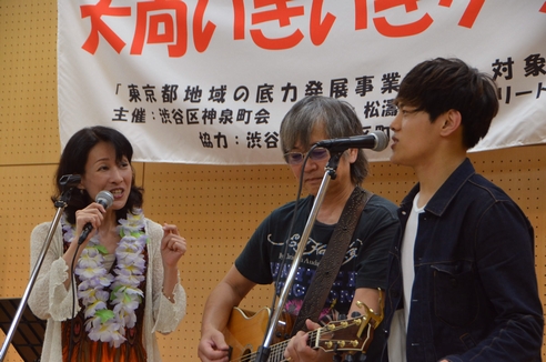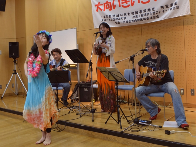 大向いきいきクラブ主催「軽音楽の夕べ」ということで、いつもと少々趣向の異なる今夜の催し。 渋谷の雑踏から少しだけ奥まった、松濤の地域交流センターにお邪魔してきました。 本日のメンバー:諸岡さん・小暮Jari孝史さん・藤名美穂さんの東京自由学院 講師陣の皆さま! そしてさらに華を添える、フラダンサー・りえさん。