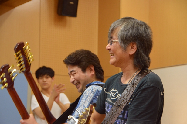 来場していた方たちを前に呼びあげてマイクを持たせ、その弾けぶりを見て、何とも楽しそうな諸岡さん&小暮さん。 こういう盛り上がり、こんな機会ならではですねー♪ MCでは、若い頃からずっと音楽をやっていて、音楽が大好きで。 子どもたちを音楽で守りたい…そんなことを話してくれました。 それを渋谷でやらせていただいていることに感謝している、とも。 今回の機会も、学院の拠点が渋谷だからこそ、なんですね。 やっぱり支え合い・繋がり合いのある地域って魅力的です。 「初心を忘れないように」。そんな言葉に続いて始まった "忘れかけた空"のイントロで、諸岡さんの表情が一変。 "歌い語り"のアレンジ。語られるのは、今日ならではの言葉たち。 カバー曲も聴きごたえがあるけれど、やっぱりオリジナル! 言葉の強さが違うのは、込めた想いの分、なのかな。 歌の途中で、「りゅうじ、出てこい!」と一声。再びのカンフーアクション!突然でも物怖じせず、すっごくいい表情♪ その表情や動きが、何となくこの曲の詞にかぶっていて。いいですねー、師弟ともどもカッコいい! 頑張れ!と声をかけられて、またまたいい表情のりゅうじ君。3月の時といい、「次」が楽しみになる人、です♪