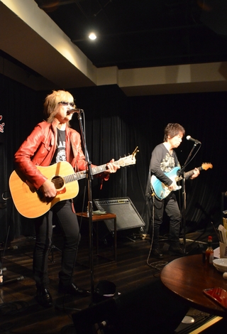 そして梅村さん&FUZUKIさんがいらしてるなー、と思ったらステージにはアコギが2本。 いつもの諸岡さんの1本と、あの独特の形は梅村さんの。 今日もあの音、聴けるのかな?と期待上昇、の開演待ちでした。 定刻少し過ぎ、諸岡さんと土方さんが登場。 まさかと思ったけど、フロア側からの出入りなんですねココ。 前列下手側席、すごい間近を通るので心臓に悪いです(笑) 「ツアーファイナルにようこそ。いきますか、ヒジケン!」と 幕開けの一曲目は"Lovin'。 サビからの入り、リバーブ強めの声と、そこに絡まるGt。 初手から音が熱いですねー♪ ちょっと崩して、潰したように響かせる諸岡さんの歌声に 歪み強めのGtがカッコいい! 聴きながら、"あ、ヒジケンだなー"って思ったのです。 どこがとか何でとか、自分でもよくわかりませんが(笑) MCで「ファイナル」を連呼する諸岡さんに、「初日・中日・千秋楽」と応える土方さん、お見事。 "体より心が"に乗せて、即興で歌いながら手拍子を誘い、Call&Resへ。