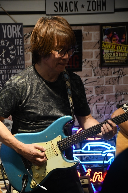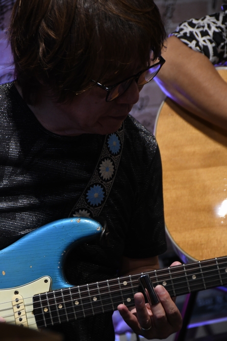 曲に戻るかと思いきや、1フレーズ歌ってましたね(笑そこから改めてアコギのイントロに戻って、曲が再開。 このあたりの緩急や呼吸、ほんとにお見事! さすがのリフと、"Fall in Love〜♪"のShout気味の声が最高でした! 熱い空気の余韻を残して、あっという間の第一部が終了。 あけて第二部。 まずは土方さん&理久音さんの2人がステージへ、 曲は土方さんのオリジナルナンバー、"STORM RIDE"! そこに諸岡さんはカメラを片手にガブリ寄って撮影を(笑 2本のギターが生み出す迫力の音、堪能させていただきました! そして満を持して(?)カメラをギターに持ち替えた諸岡さんが登場。 今日はNew Gearがあって…と、とっても嬉しそうな表情で足で何やらカチャカチャと操作していたのは…Looper♪ 流れ出すリズムに音を重ね、1人でもやるー!と"SHOUT"がスタート。 「諸岡ケンジ、ギタリスト!」なんて声と、フロアからのHand Clapの中で始まったのは、3人、三者三様のカッティング合戦!