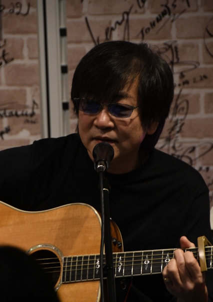 カバーから入るのも最近ではあまりなかったのに、この曲はライブで聴くのは初めてな気がします。 何でも、今日は雨が降ってたから…と急遽演ったそうで。 こんなシーンも、こちらでのライブならではですねえ♪ ひと息おいて、新アルバムから"手紙"。 柔らかく抜ける声と、3本のギターの響き合いが気持ちいい。 後半に見せた、ふっと遠くを見る目が印象的でした。 歌終わり…と思いきや、いきなり"手紙"のメロディで 「花粉症がキツイ〜♪」と歌い出す諸岡さん(笑) 目やらノドやら色々とアレルゲン不明な症状が出たそうな。 空気が和んだところで、しっとりと"抱きしめながら"。 アコギに重なる2本のギターの音色がどこまでも優しくて、 まだ少し肌寒い、こんな雨の夜にしっくりと馴染む曲。 MCを挟んで、土方さんがリードを弾き始め…たところに、「ちょっと待って」と諸岡さん。 ForeigerのHead Gamesを思い出して歌い出しそうになっちゃった…と(笑) びっくり笑顔の土方さん、仕切り直しで再びのリード。 あれ?これってもしかして…と思ったら、やっぱり"風の中のストーリー"!アレンジばっちり♪ 2本ののカッティングがコロコロと気持ちよくて、合間に入る諸岡さんのフェイクもハマって。 理久音くんのソロ、そして土方さんのコーラス。曲のこの化けっぷり、ヒジケンリクの醍醐味!