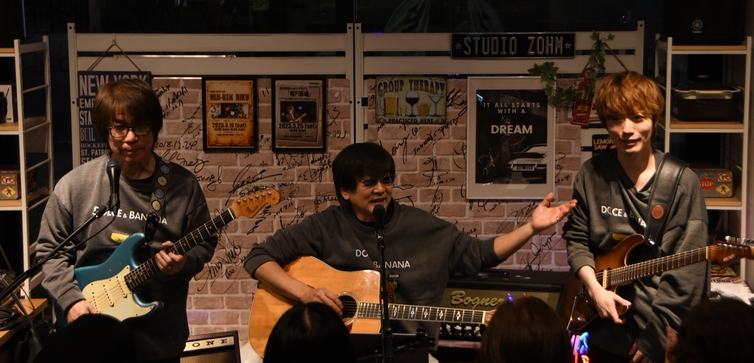 そして、「大好きな曲」と前置きしての"空"。うん、私も新アルバムの中では一番のFavorite。 いつも、タイトル曲を差し置いてラジオへのリクエスト書いてしまうくらい…(笑) 土方さんの手には銀色に光るスライドバー。この音がいいんですよね。 時折、期せずしてアコギの弦がキュッと鳴る音と重なったりするのが、さらにまた…♪ 今日も心の中に、たくさんの"あの日の空"が広がりました。 親子な会話をまじえたMCの後、第一部の最後に…と"秘密基地"をゆっくりと。 これはもう、諸岡さんの声がとにかく絶品ー!のひとことに尽きました。 間奏でのツインギターのフレーズ、そこに重なる声のさらなる力強さ。 バンドとも、弾き語りとも違う迫力は、やっぱりこの"ヒジケンリク"ならでは。 これだから、どのライブも見逃せないのです>< そしてここで、お店からお誕生日プレゼント!というサプライズ。 ZOHM DREAM DINERオリジナルの"DOLCE&BANANA"を3人お揃いで♪ 休憩中にいそいそと着込んだ皆さん。代わる代わるの写真攻めにあっておられました(笑)