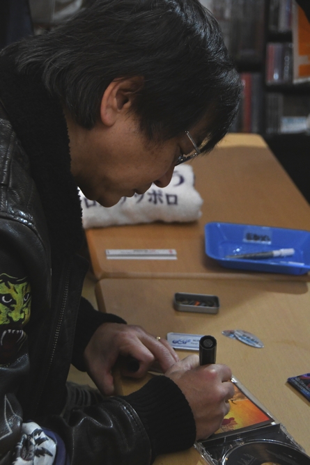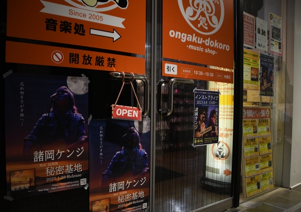 入口には、ポスターや今日の告知フライヤーもたくさん♪扉を開けて店内に入ると、カフェスペースやライブステージ、 そしてたくさんのアーティストのサインやメッセージ。 本当に音楽を愛し、楽しむ方の集うお店なのですね…! 開演の15時になる頃には、店内にはたくさんの人! いつもながらお見事なトークと歌声の長友さんの後、 諸岡さん初のインストアライブがスタート。 意外にも、デビューしてから一度もこういったインストアはやられたことがないのだとか…。 まずは、北海道限定のCMを歌っていた…という話題からの"Dead or Love"で幕開け。 重厚な音が重なる原曲ですが、今日は弾き語りで。スローなテンポと、重めに響く声がカッコいい! ナマ音に近い、乾いたアコギの音色と、ストロークの間が何とも言えず渋い♪ そして、CM繋がりの"Heart to Heart"。タメが気持ちよさ、これは弾き語りの醍醐味ですね。 2コーラスのあたりで入ったブレイク、最高でした! 開始前、そして長友さんのステージの間にもセットリストを書き直されていた諸岡さんですが、 どうやらMCしながら、さらに歌いたい曲目が変わっていったようで…。