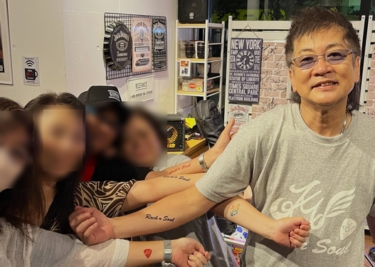 ここ最近、Tシャツ、タオル…とオリジナルグッズが登場しているわけですが同じデザインで色々と試作(という名のお遊び)しているうちの1つ。 水で貼って剥がせるインスタントTatoo♪ 今日のライブにお越しになった方々に、プレゼントさせていただきました! ライブ終了後に、諸岡さんが「俺も貼るー」と言ってくださったので遠慮なく(笑) さー、次は何を作ってみましょうか★ ←Back to Live Report Menu |