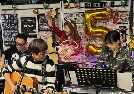 そこに入るベースライン、これがまた最高にイイんですよね。艶やかな音の中で、時折フェイクを交えながらの伸びやかな歌声が素敵でした! そして、先日の九州や札幌などなど、あちこちを回ったライブの話と、 そこでは色々な出会いがあって…と、曲は"Love Me Tender"へ。 大きな手拍子と、すっかりお馴染み?となったハートのハンドサインもばっちり決まって あちこち笑顔がたっぷりで第一部が終了。 第二部は、またまた(?)仲間とこっそり仕込んだサプライズからスタート! 今月で5周年を迎えたZOHMと、いつも素敵なオーナーの純子さんへのお祝いを♪ 諸岡さんの「5周年おめでとう!」のコールから、"夢の隣に"の1フレーズで "〜の隣に…純子がいるから〜♪"とステージエリアに招き入れて、ご挨拶タイム。 ささやかながら、有志でご用意したお祝いをお渡しさせていただきましたー! ご協力いただいた諸岡さん、Takさん、啓三さん、フロアの皆さま、ありがとうございました♪ そのまま純子さんも一緒に、"アンジェリーナ"でライブタイムに突入。 アップテンポな曲と純子さんの笑顔で盛り上がったところで、拍手を挟んで"戻れない夏"へ。 こんな風に色合いの異なる曲に繋がるとよくわかる、歌によって変わる声の表情をたどるのもライブならではの楽しみ。