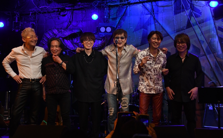 前回の小南数麿さんに代わって、"父子鷹"理久音さんが参加♪場内のBGMが"エール"に変わる中、メンバーの皆さんがステージへ。 最後に登場した諸岡さん、笑顔で初手から煽ります! 拍手で盛り上がるフロアに、まずは周ちゃんのカウントが飛んで "アンジェリーナ"で本日のライブが開幕。 タイトさと絢が絶妙で、やっぱりこのバンドの音、華がありますねー♪ 先日のライブでは少々本調子が出せなかったという諸岡さんの声も、 今日は万全ばっちりで伸びやか! 最後の音をドラムが受けて"Top to the Mountain"…だったのですが、 この繋ぎがもう、神がかりなカッコよさで。 諸岡さんが自在に操る、時に渋く、時にまっすぐな声も絶品で、 ラスサビの1フレーズはアコギ1本で歌い上げてくるし、 アウトロはユニゾンするリフにツインギターが映える映える。 ライブで聴くは久しぶりな気もするけれど、こんなにストレートな熱さも出してくる曲だったとは! クールダウンするように軽めのMCを挟んで、アコギで"Moonlight Surprise"の一節、コーラスの "You gotta…♪"を爪弾いて、いきなり中さんへ、そしてメンバー1人ずつに順番に歌わせる展開に(笑)