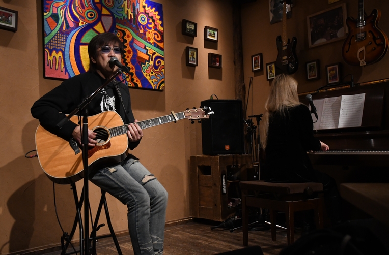 まずはしっとりと優しいピアノの"Heart to Heart"で幕開け。こういう入り方、初めてかも? 諸岡さんの歌声もいつもより柔らかく響いて、 ひと声ごとに店内の空気に馴染んでいくようでした。 歌終わりをアコギで繋いだ"ただひとつの嘘"は、かなりスローに。 洒脱な色を纏って、細やかな音を重ねる浜崎さんのピアノと、 時折アコギの弦の擦れる音が何ともメロウで、声の情感が引き立つー! 2曲ですっかり惹きこまれたところで、今日のMCの第一声は 「63歳になって初めてのライブです!」 今日、大阪入りしたという諸岡さん。新幹線が混んでたー!だそうで。 (確かに超満席+到着したら前回以上に人が多くてびっくりでした) 続いては、アコギのストロークとJazzyなピアノで"Dead or Love"。 前2曲とは色合いの違う、アコースティックなのにフルスロットル。 鋭さを交えた音と歌声が曲に似合っていて、熱い!渋い!カッコいい! ラスサビで、音を落としてアカペラっぽく聴かせた声が最高でした。