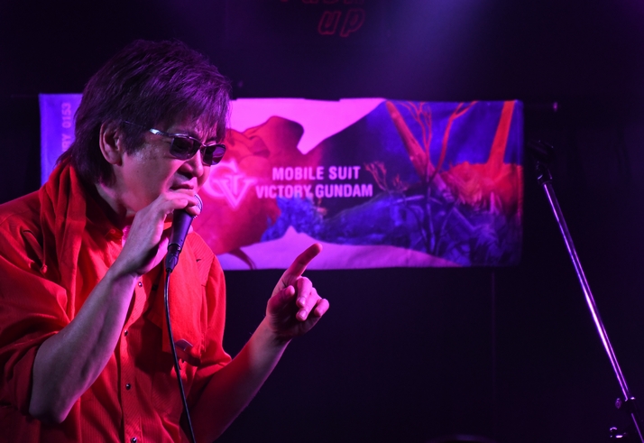 ステージ上にはファンの方が持ち込んだVガンダムやメタルジャックのプラモがたくさん並び、 背後にはガンダムのキャラクタータオルが掲げられ、 フロアはアニメやアニソン愛にあふれた方で満席! 1st Stageは長友さん。 客席を巻き込むトークと熱い歌声のパフォーマンス炸裂。 遠方から日帰り(!)で参加されたファンの方の姿も♪ そして長友さんからのコールで、諸岡さんが再登場。 「長友くんのペースに嵌らないように」と笑いつつ、 2人でたっぷりトークしながらアコギを手に。 2nd Stageは、諸岡さんのオリジナル曲で展開する、 オケ持ち込みで…という、滅多にない形でのライブは 1曲目の"Dead or Love"でいきなりトップギア! 歪ませた声も、鋭く響くアコギの音色も渋かったー! 「次は…メタルジャック知ってる人!」という呼びかけに、ほぼ全員の手が上がったのは さすが今夜の企画ならでは、の光景ですねえ。 普段は聞けない、当時のことを交えたMC。まさかあれ着てライブしたことがあったとは。 もちろん、ヒヅさんのエピソードも話してくれました♪ 「アレンジ凝りすぎてて…」って、ヒヅさんあるあるです(笑) 弾き語りで歌い出した"Just Dream On"の1フレーズに、合いの手が入るのがさすが!