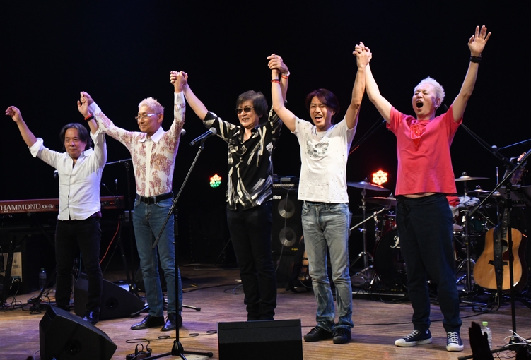 場内の空気まで操るようなセットリストの緩急と、一瞬で声の表情を変えてくる諸岡さん。この展開、いつもながらお見事…! 続くMCでは、大分での初参加から福岡、そして最終日の今日も来てくださった方のこと、 そして今日の日まであちこち走り回ってくださった同級生の皆さんのこと…。 そこから、今回の九州ツアーの契機ともなった宅島建設の金谷さんと幹部の方がステージへ。 "エール"をCMに起用されたきっかけや、これからのことを話してくださいました。ラジオー! 演奏されたのは、もちろん"エール"。 アウトロに響いた"Wow Wow…♪"の声のように、たくさんの応援が広がっていきますように! 勢いを増した音のまま、曲は"凹んでんじゃねえ"へ。 バンドの熱量と、フェイクを交えて少し崩した諸岡さんの歌声の熱が重なり合って、 これはもう一緒に"Keep On"するしかない♪ メンバー、そしてフロアにコールを回し、さらに「拳あげろー!」と生声で煽る諸岡さん。 麿さんのソロも華やかに、最後まで一気に駆け抜けていくようでしたー! 歓声と大きな拍手の波の中、今度は「九十九島の夕陽を思って作った曲を」と"忘れかけた空"。