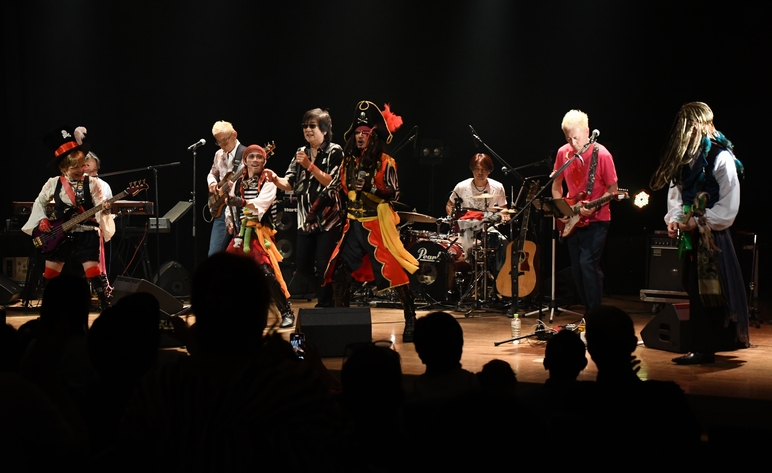 歌い語りで伝えられた感謝のことば、そしてメンバー紹介からソロ回しへと移り、もっともっと…と熱くなる声と音にただただ魅入られて息をのみ…。 これぞ、という迫力の中で、コンサート本編が終了。 もちろん湧きおこった大きなアンコールに応えて、まずは諸岡さんが登場。 音響を担当されている"弟分"のご紹介、そしてメンバーを1人ずつ呼び入れ、 全員が揃ったところで、入場時に受付で皆さんをお迎えされていたV-PRO海賊団を召喚! キャプテン・コフィを先頭に、海賊たちが客席からステージへと登場し、しばしのトーク。 そして、動画撮影もOK!と"Don't Stop!Carry On!"を派手に決めてくれました! さすが今日は"本来の姿"の海賊たち、キャプテンの声も皆さんのアクションもばっちり♪ キュートな笑顔のウェンディさん、たたずまいに渋さの滲み出る?アーツさん、 そしてデッキブラシで縦横無尽のシュンターさんも最高! ステージへの大きな拍手はもちろん、コンサート終了後のロビーでも大人気でした…♪ ★V-PRO海賊団:https://vprokaizoku.wixsite.com/vpro ![]() 拍手とともに海賊たちを見送り、改めてマイクを持ち直してのMC、 そしてハンドマイクで歌われた"秘密基地"の万感交到る響きは、 故郷、佐世保ならではの…そして、この空気の中でこそ感じられたもの。 その声、その音の1つ1つを涙とともにひたすらに噛みしめておりました…。 鳴りやまない拍手に応えてのWアンコールは"Endless Road"。 "ENDLESS ROAD 2004 IN SASEBO"と題されたライブが行われたのは ちょうど20年前の8月の終わり、今日と同じ、ここアルカスのホール。 光に包まれたステージに、あの日が重なって見えたようなひとときでした。 終わりなき道に想いを馳せて、本日のライブ、そしてこの九州3Daysを締めくくりとしたツアー2024"エール"が終了しました。 ツアーへの協賛や応援団、佐世保市教育委員会の後援、市内の中学・高校へのCD寄贈や無料招待、初の電子チケット…などなど、 今回も貴重な体験をさせていただきました。