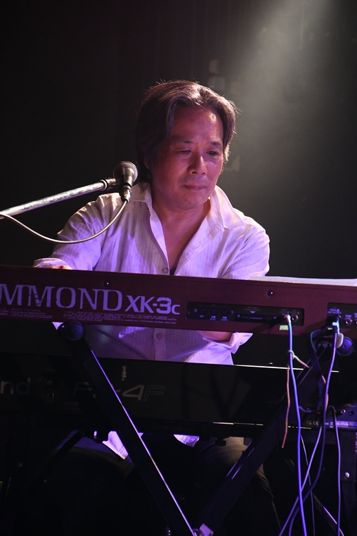 リハ参加者の皆さんには特典としてプレゼント、ということでさっそくフロアのあちこちで黒&赤がひらひらしておりました。 改めての音出しから始まったリハーサル。 内容は参加した方だけのお楽しみですが、リハだけで演った曲があったり 本番と違うアレンジを聴かせてくれた…はずが、仕上がりがよすぎて メンバーの後押しで本番で採用されることになったり、とレアな場面尽くし。 今後もこの企画があるかは分かりませんが、機会があったらお見逃しなく♪ そして再入場のインターバルを経ての本番開演。 "エール"をSEに登場した、本日のメンバーの皆さまは ステージ下手から、恩田直幸(Kb)/住吉中(Ba)/中野周一(Drs)/小南数麿(Gt)。 最後に、白いジャケット姿の諸岡さんがステージへ。 1フレーズ声を乗せたところを恩田さんの音色が一閃して"Lovin'"。 この、一気に歌の世界へと引き込むような入り、つくづくカッコいいんですよねえ…。 続いて、ドラムの重さとキレ、そして全体的に硬めな響きの音が似合っていた2曲目の"アンジェリーナ"。 序盤から熱気たっぷりの諸岡さんの声は、スタンディングしたくなるような勢いと強さ。