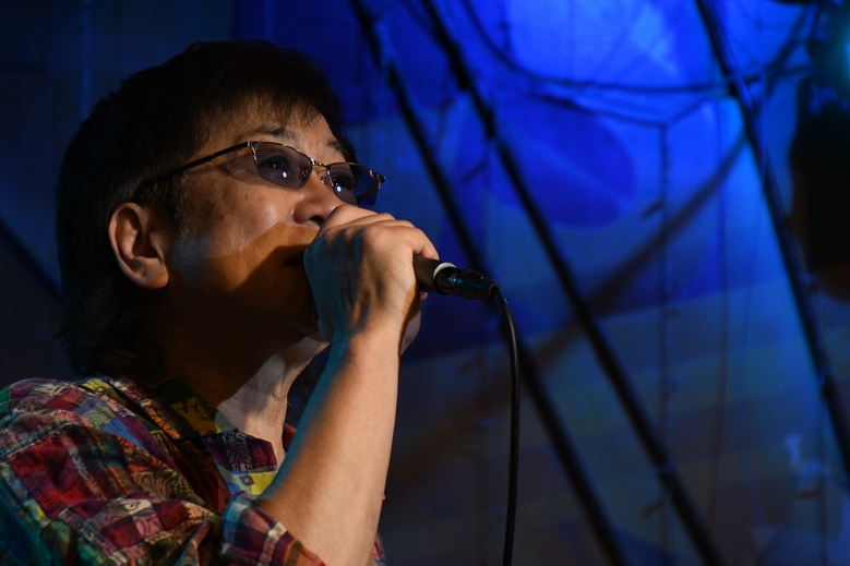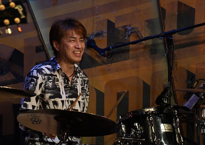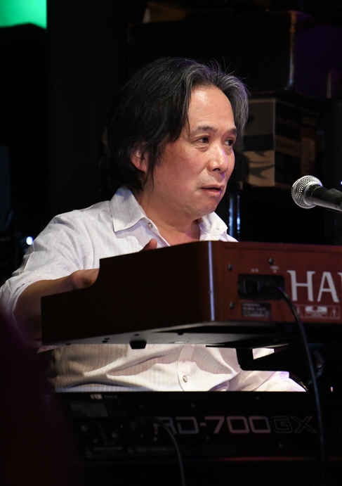 おさえた音と、柔らかく、それでいて力強い歌声が深い余韻を醸し出し、ピアノに静かに重ねられたドラムから伝わる空気の震えと相まって、 いつも以上にココロに深く響いた1曲で第二部、ライブ本編が終了となりました。 そしてアンコール。 まずは諸岡さん1人が登場して、今後のライブの告知を。あれ?来月の京都&大阪は? そう思っているうちに、メンバーの皆さんを1人ずつコールしてステージへ。 土方さん、麿さん…と進んで、ラストは還暦Tシャツにお召替えした周ちゃん。 全員が揃ったところで飛び出したのは「…何の曲がいいですか?」のひとこと。 おそらく私以外は分からなかったアレ、"ガラス越しのファイナルレイン"…それ、いろいろ曲名が混ざってます諸岡さん(笑) アンコール1曲目は、土方さんの奏でるイントロから"Eternity"。