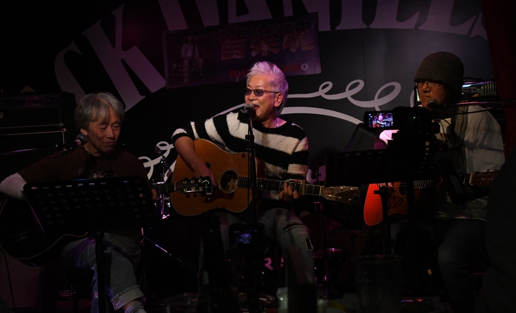マコトさん、白浜さんとの3人では初合わせでリハもなし(!)らしく、「シャッフルで!」とKeyを伝えて"体より心が"。 笑顔で「あっためましょうか」とフロアに振った"Oh Yeah!"のCall&Res、 もちろん、ばっちりと声が上がっておりました。 3本のアコギが重なる、どこかBluesyな響きと絶妙な掠れの声がカッコいい! ラストの音をそのまま繋げて歌い出したのは、まさかの"Unchain My Heart"。 これまた渋い声がハマの夜に似合う♪ おそらく予定外の1曲だったこちら、1コーラスで終わったのが残念(笑) そして松下さんが加わっての4人で、福島でも歌われた"風の中で立て"を。 これまで何度か歌い重ねてきた諸岡さんの表情と歌声の変化に、 アコギの厚みとコーラスの深みが相まって、一層の感慨を抱く響きでした。
