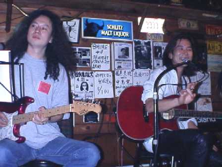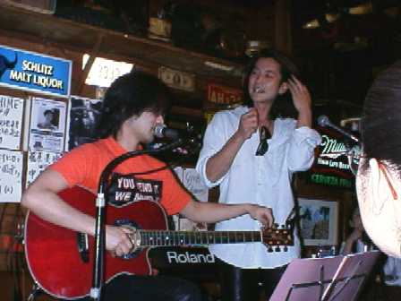 そして、今回のSPECIAL GUEST!カウンターで飲んでた原田喧太さん♪ 「そんな、いきなり?」と言いつつ、 諸岡さんのギターを持ち、歌ってくれました。 1曲目"God Only Knows"(ネコさん、感謝!) なぜか途中で「やめた〜!」(笑)で、2曲目 マロさんも加わったのですが、 こっちは 曲名が わからない(^ ^;) ↑"ポールモールに火をつけて"だそうです!(またまた感謝♪) そう言えば喧太さん、諸岡さんを強請るとか何とか・・(笑)