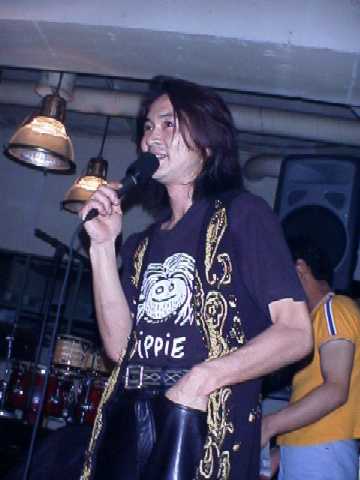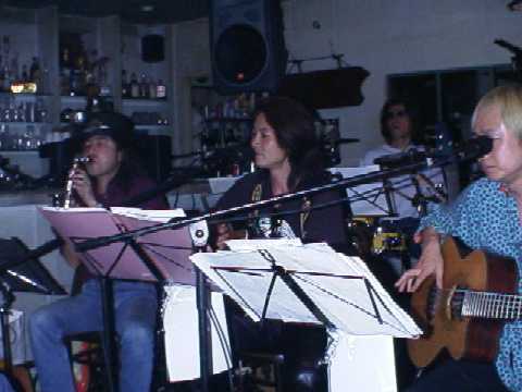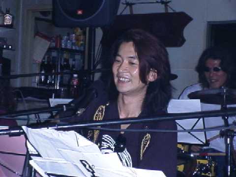 しかし、ROMA CAFEのLIVEって、毎回なぜか雨が降ります…雨男は誰だ〜?? 今回は、JUN-BOHこと河内淳貴さんの誕生日のスペシャルLIVE!! 趣向を変えて…って、中に入ってみたら、店の半分がステージになってました(笑) キーボードは入ってるし、JUN-BOHさんの楽器+荷物はいつもより多いように見えるし… 「これでキーボード弾くやつが来なかったらどうしようか〜」なんて言ってる方もいたりして。 始まる前から”今日は違うぞ?”と期待してしまうような雰囲気でした。 まず、のっけから笑わせてくれます。恒例(?)の小話シリーズ♪ 今回は ”わかんないでほっといて帰るのがイヤ♪” …でした(笑) 皆さん初めからテンションが高いです。諸岡さんもビールがすすんでいるようです(^ ^;)