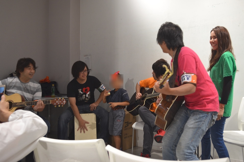 場所は、ミートボール♪でお馴染みのイシイ食品さんのコミュニティハウス。パパやママと一緒の子どもたちと、素敵な笑顔のTeam Kakawariの皆さま。 なんかこの暖かい空気、懐かしいなー、と思いつつ入らせていただきました。 キッチン付きのイベントスペース。身近にこういう所があるっていいですねー。 今日は親子クッキング的なこともするそうで、私もレシピいただいちゃいました! 音楽隊(笑)の皆さま: 諸岡さん、小暮孝史さん、石井裕介さん、そしてカホンで参加の山崎滉平さん。 主催 兼 司会進行 兼 歌のおねえさま、中林さん。 そして可愛いお子さん数人も一緒に歌って踊って♪という感じ。 まずは石井さんが会場に因んだイシイのCMソング集で盛り上げにかかり、 山崎さんがカホンで加わって、中林さんが歌う"ようかい体操"で子どもたちが踊り出し… そして、諸岡さん&小暮さんも加わって、いよいよ?カカワリ食堂ソングのお披露目。 You Tubeで聞けるのは2番までだけど、今日は一緒に歌っていたお子さんが作詞した "子どもからのアンサーソング"の3番まで!とっても可愛い声だった〜♪ おもちゃをシェイカー代わりに参加していた子も、ソロをばっちり決めてたり。 見てて楽しくて、こういうの好きだなー。みんなほんわかしてて。 諸岡さんも終始ニコニコ。歌ってる子どもを見る表情がパパの目でした(笑) みんなの笑顔と拍手でお披露目&演奏タイムが終了ー。