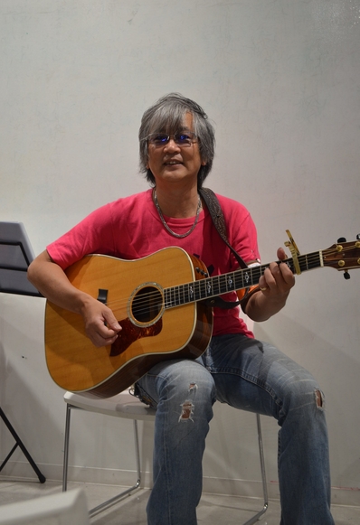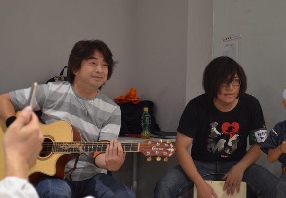 …と思ったら、次のクッキングプログラムに移るのに少し準備の時間が必要になったようで、石井さんに場繋ぎの指示が(笑) そこを諸岡さんが笑いながら引き取って、「じゃあ大人の歌を歌います!」と再びギターを手に。 「あ、俺もか」と小暮さんも戻ってきて、"風の中のストーリー"を聴かせてくれました。 これは予想外〜♪マイクもアンプもなし、の生音で聴けるなんて滅多にない!ので、大ラッキーでしたー。 むしろ、間が空いてくれてありがとうございます、でしたヽ(゜∀゜)ノ